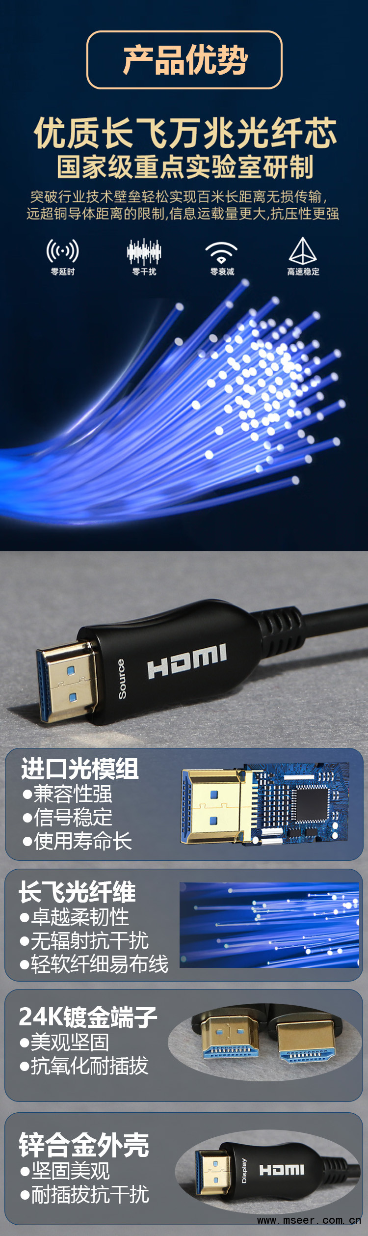 HDMI光纖符合2.0規范,傳輸速率可達到18G,可以支持 4K@60Hz畫質以及 4:4:4傳輸效果;向下兼容2K&1080P&3D等畫質。信號衰減小于0.0035db/米,突破傳統銅纜傳輸距離受限制的瓶頸,可以實現150米的遠距離傳輸。